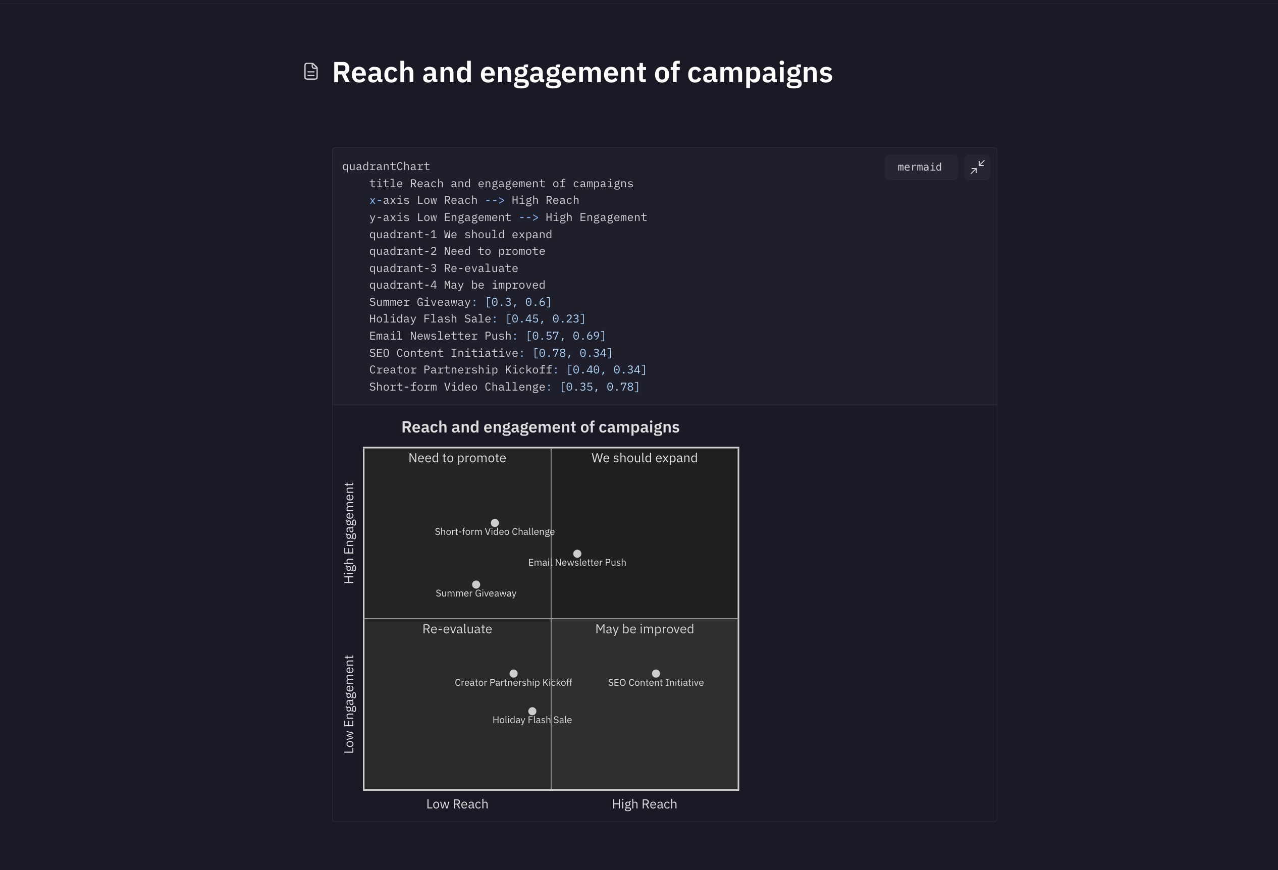 You can now easily add diagrams and charts to your documents or task descriptions with MermaidJS integration! Create flowcharts, graphs, sequence diagrams, user journeys and even Gantt charts with Markdown syntax — no advanced coding skills needed. To create a new MermaidJS diagram, type `/` and select `Diagram` from the menu. Enter your code block and your diagram will be automatically generated. For inspiration and guidance, check out the MermaidJS docs. #7272