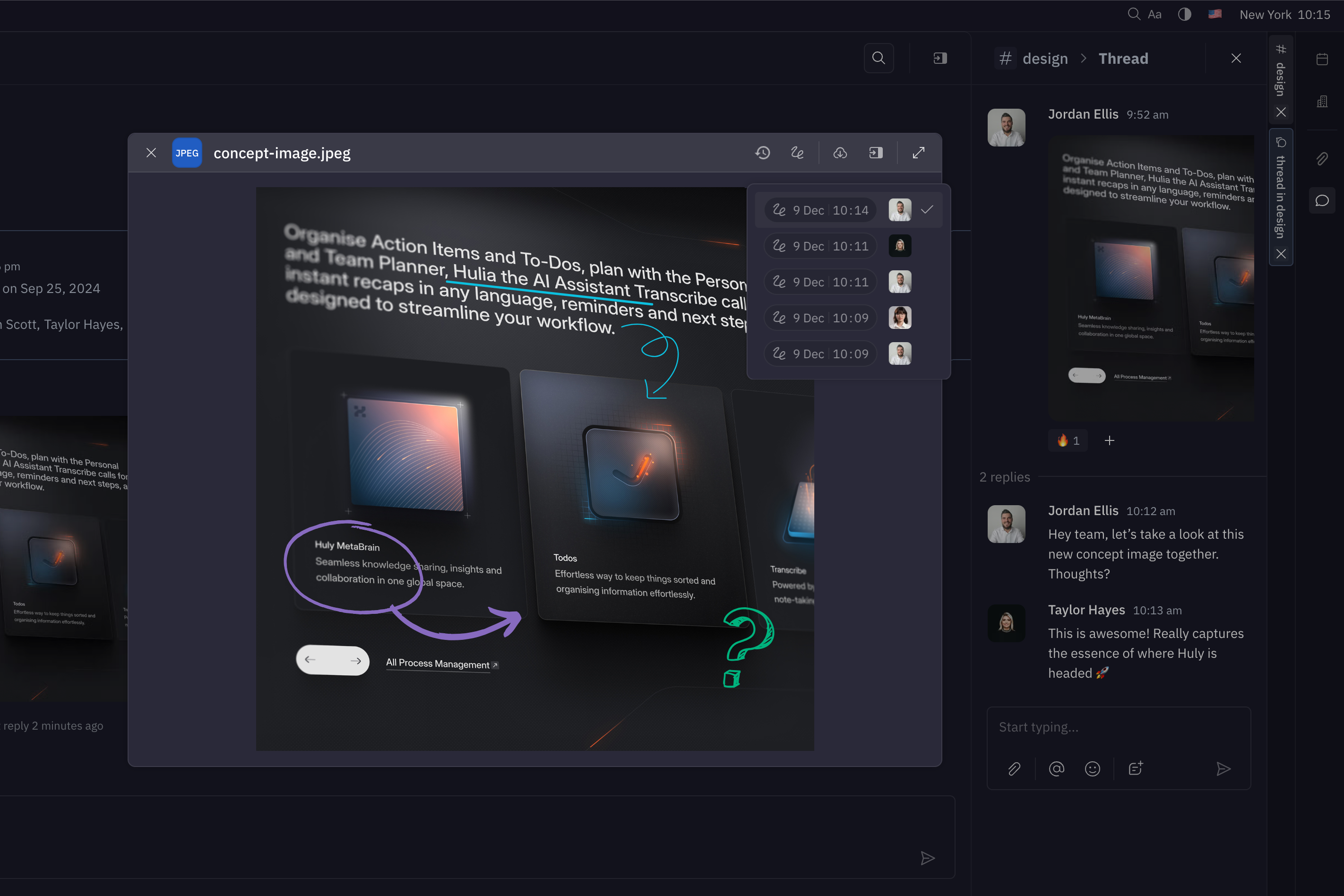 Turn shared images into collaborative drawing boards! Click the `Scribble over` icon on any shared image to draw, annotate, or provide feedback using tools like the pen, eraser, text box and color picker. Track edits with the `Scribble history` option, which shows all previous scribbles and who contributed them. Perfect for brainstorming, reviewing, and sharing ideas visually! #7216