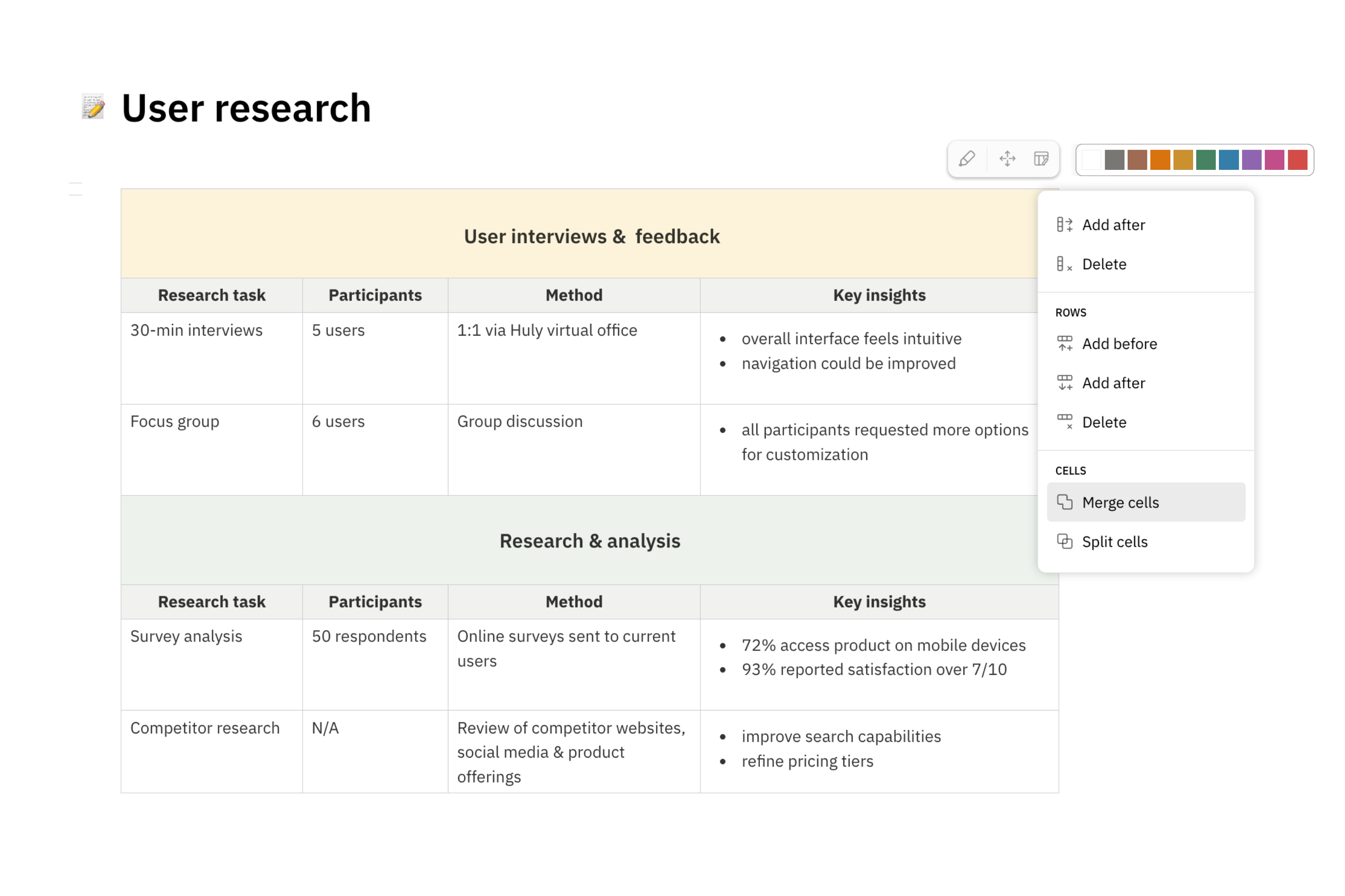 We've been eager to release this set of highly-requested advanced formatting capabilities for tables in Huly! With the new advanced table editor, you can resize columns, merge and split cells, and easily add, delete and rearrange your rows and columns. A color palette of muted tones allows for even more customization of your tables with beautifully color-coded cells responsive to both light and dark mode interfaces. See other PRs related to this feature here and here. #7509