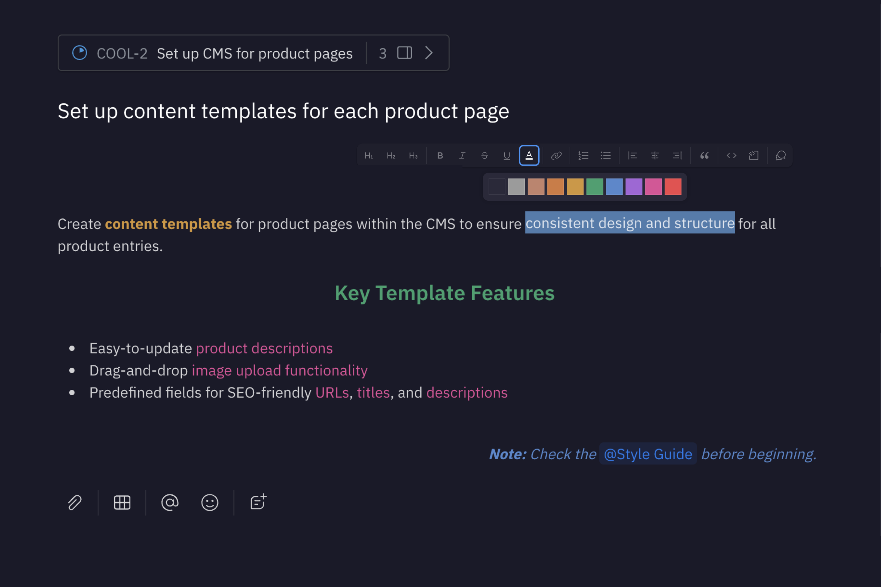 With this latest release, we're excited to introduce Huly's new inline comment feature to help you collaborate more productively with your teams. Inline comments are available in documents, issue descriptions and anywhere the comment icon is available in the editor toolbar. To add an inline comment, simply highlight any text and select the comment icon in the toolbar; then enter your comment and hit send. Anyone with access to the document or issue can view and reply to comments, making it simple to keep track of feedback and discuss specific sections. You can edit or delete your comments at any time by selecting the three dots next to the comment, and resolve comments with the checkmark icon once they've been addressed. #7473