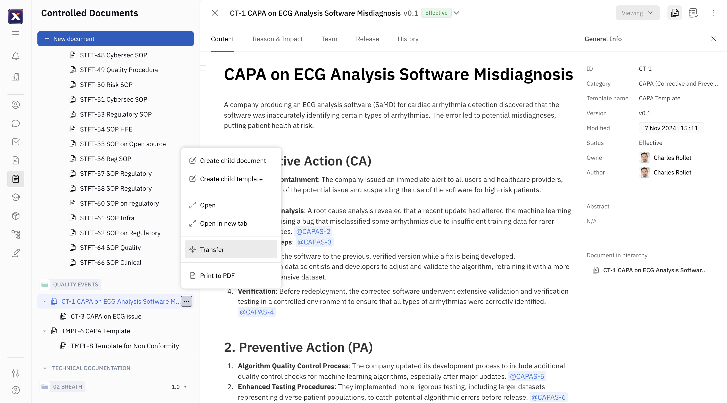 This new eQMS feature enables users to transfer controlled documents between spaces, a critical need for Quality Assurance and Regulatory Affairs (QARAs). It mirrors functionality previously available in uncontrolled spaces while introducing safeguards for controlled environments. Users can move documents only if they meet specific criteria, such as being created in the current product version, and if they have the necessary Role-Based Access Control (RBAC) permissions—specifically, archive rights in the source space and document creation rights in the destination space. The UI supports drag-and-drop functionality within a space, while transfers between spaces utilize a confirmation dialog similar to ownership changes. #7668